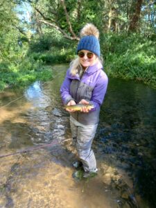 A very pleasant session on the river with fellow instructor Claudia Audley. Started off cold and blustery but then brightened up. The river was low and exceptionally clear. The massive summer weed growth had died back at last. Perfect for Tenkara!